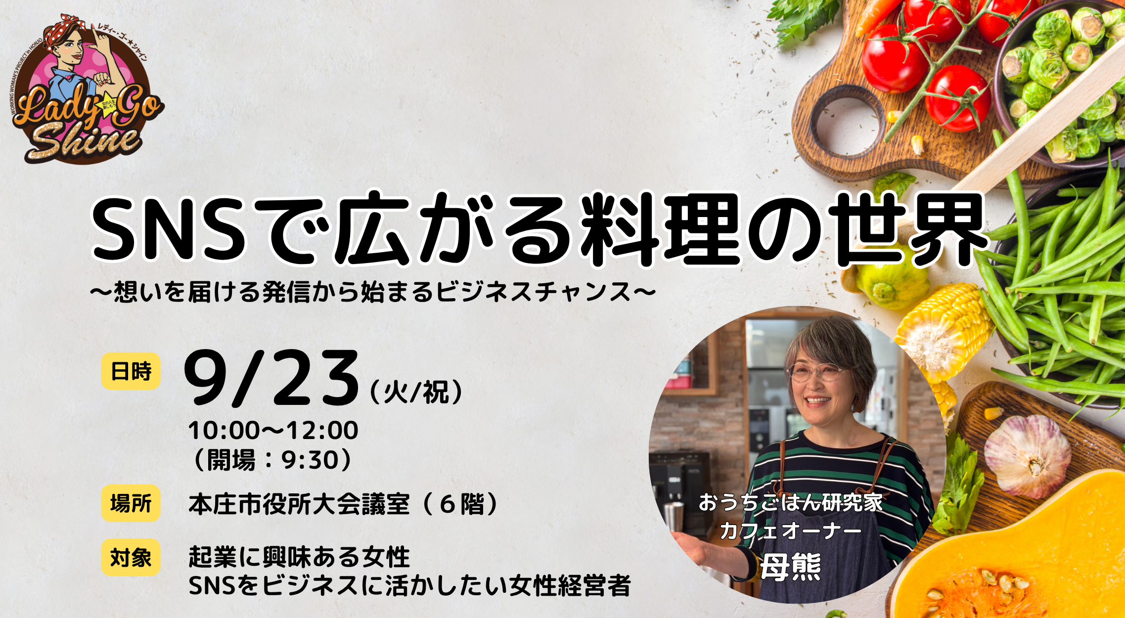 SNSをビジネスに活用して集客やファン化に繋げたいですよね。でも、多くの人は思ったように上手くいかずに挫折してしまうもの。「SNSをビジネスに活かす方法を教えて欲しい」という多くの声を受けて実現した今回のセミナー。講師はなんと、おうちごはん研究家であり、インスタグラマーでもある「母熊」さん。家庭料理から始まり、インスタグラムでは最高12.8万フォロワーを獲得、SNSをきっかけに本を出版、さらにカフェ開業まで活動の幅を広げてきた現役バリバリの母熊さんから、実体験に基づくSNS活用法を教えてもらいましょう!