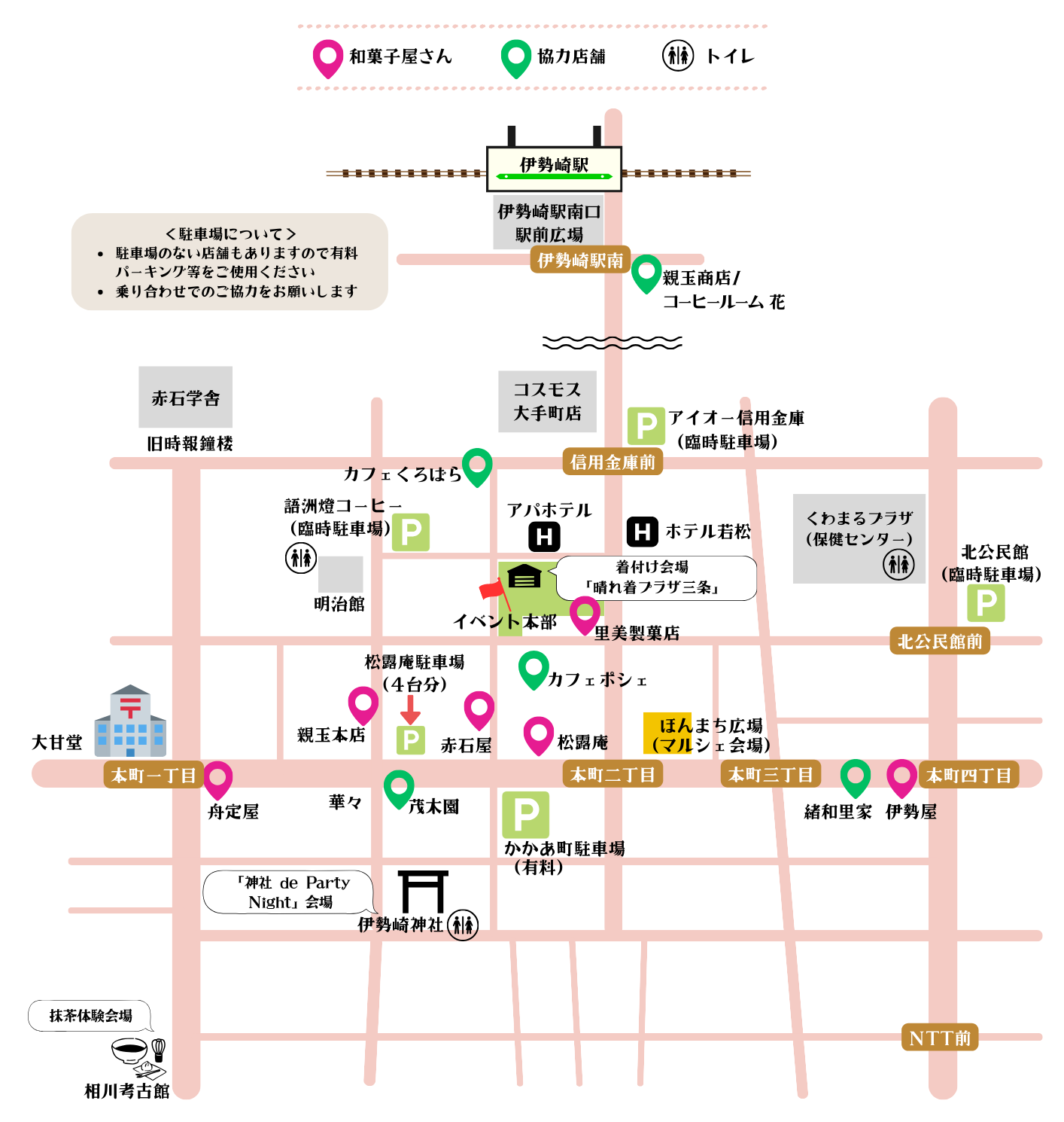 参加料など | ・和菓子チケット:税込1,000円 ・着物de街歩き:税込3,000円〜(伊勢崎銘仙レンタル付)※着物持参の方は着付け料のみ税込1,000円 ・相川考古館での抹茶体験:税込1,200円(ISESAKI和菓子セット付) ・神社de PARTY NIGHT:参加無料/ドリンク販売あり |