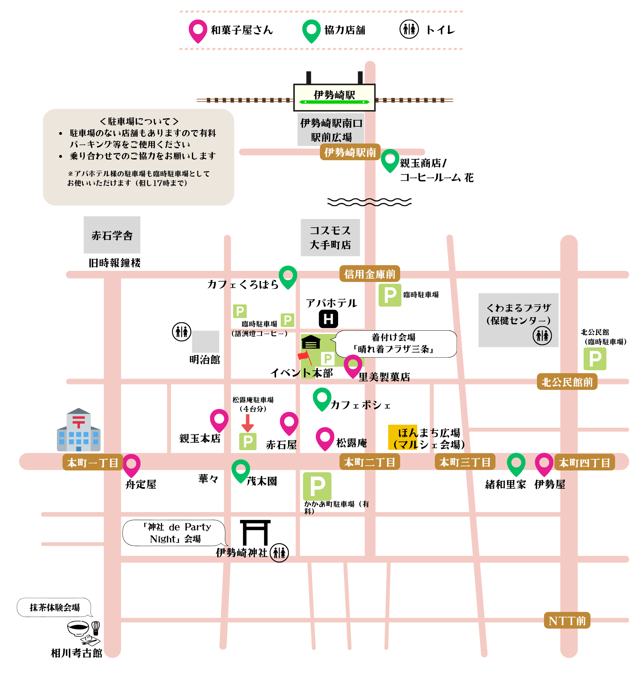 | 参加料など | ・和菓子チケット:税込1,000円 ・着物de街歩き:税込3,000円〜(伊勢崎銘仙レンタル付)※着物持参の方は着付け料のみ税込1,000円 ・相川考古館での抹茶体験:税込1,200円(ISESAKI和菓子セット付) ・神社de PARTY NIGHT:参加無料/ドリンク販売あり |