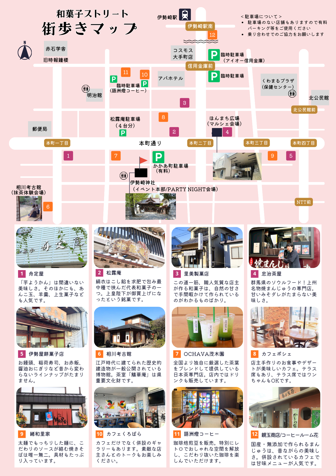 | 参加料など | ・和菓子ストリートチケット:¥1,500(街歩きチケット3枚+選べる特別和菓子チケット2枚の計5枚セット ・着物de街歩き:税込3,000円〜(伊勢崎銘仙レンタル付)※着物持参の方は着付け料のみ税込1,000円 ・相川考古館での抹茶体験:税込1,200円(ISESAKI和菓子セット付) ・神社de PARTY NIGHT:参加無料/ドリンク販売あり |