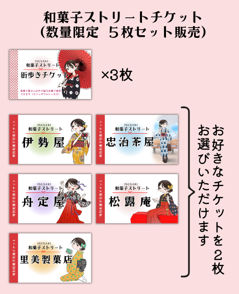 「街歩きチケット」3枚+「選べる特別和菓子引換チケット」2枚の計5枚セット